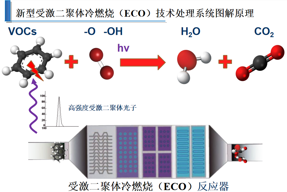 我公司針對低濃度、大風量的VOCs有機廢氣,利用新型的低溫氧化處理技術開發出了一套化工尾氣ECO冷燃燒處理裝置。該裝置通過受激二聚體光子誘導,常溫氧化揮發性有機物VOCs和異味、惡臭氣體,克服了UV光催化氧化技術紫外光強度低,處理效果差的技術瓶頸,同時避免了傳統方法運行維護成本高的難題。
