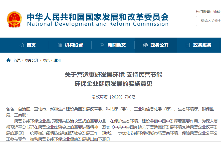 為深入貫徹習近平總書記在民營企業座談會上的重要講話精神,落實《中共中央 國務院關于營造更好發展環境支持民營企業改革發展的意見》(中發〔2019〕49號),統籌推進疫情防控和經濟社會發展工作,2020年5月22日國家發展改革委、科技部、工業和信息化部、生態環境部、銀保監會、全國工商聯等六部門聯合印發了《關于營造更好發展環境 支持民營節能環保企業健康發展的實施意見》。